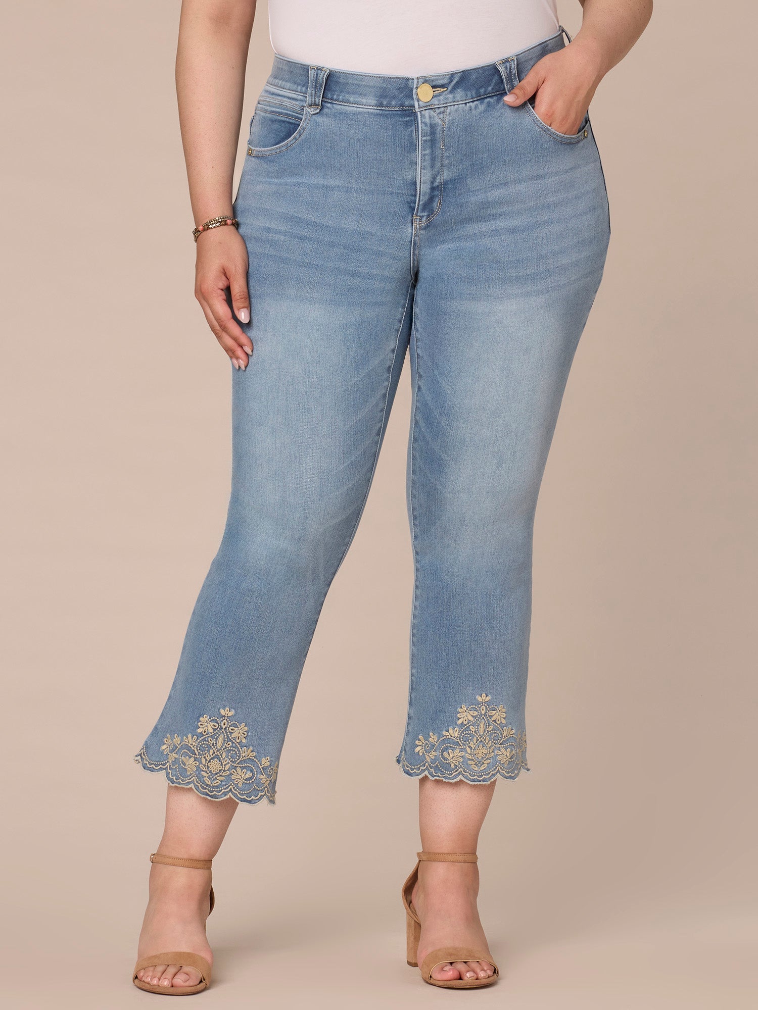 Meet the jeans you can wear with literally everything in your closet. These “Ab”solution® Itty Bitty Flare jeans in plus sizing have a high rise waist, a cropped scallop embroidered die cut hem, and our signature fit technology for a figure-flattering fit and all-day comfort.
