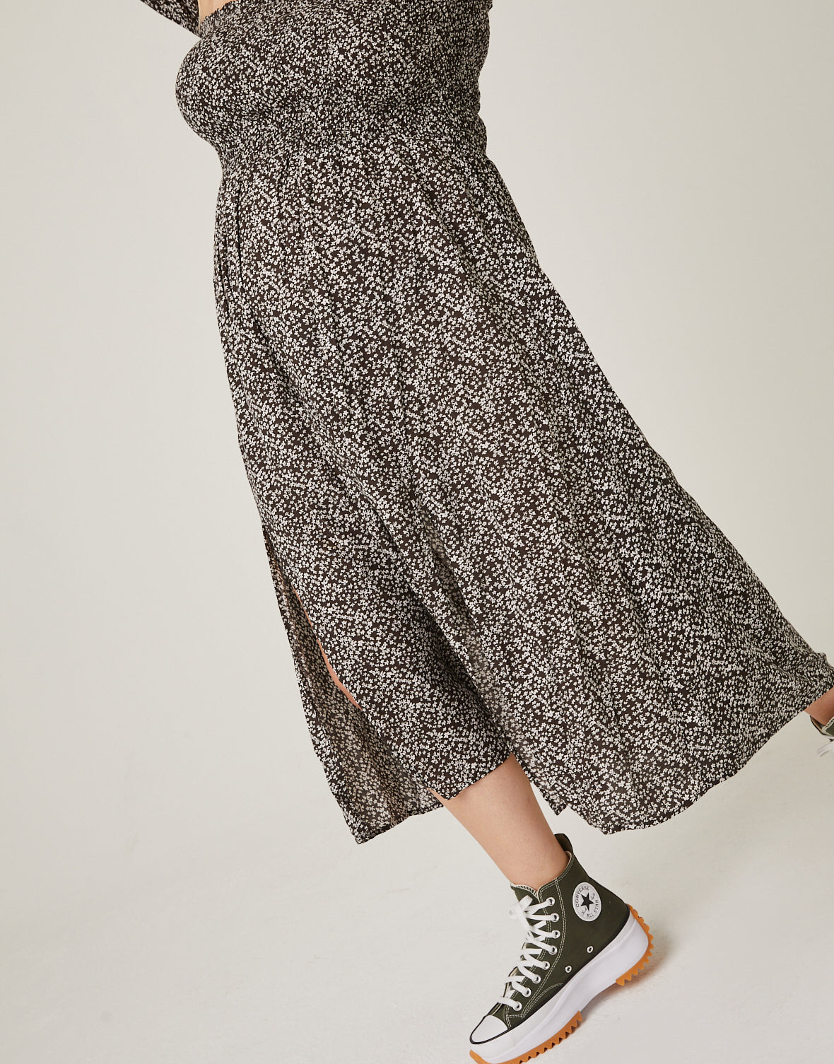- This dress features a smocked top, flowy bottom, midi length, short puff sleeves, off-the-shoulder neckline, and double slits on the bottom.
