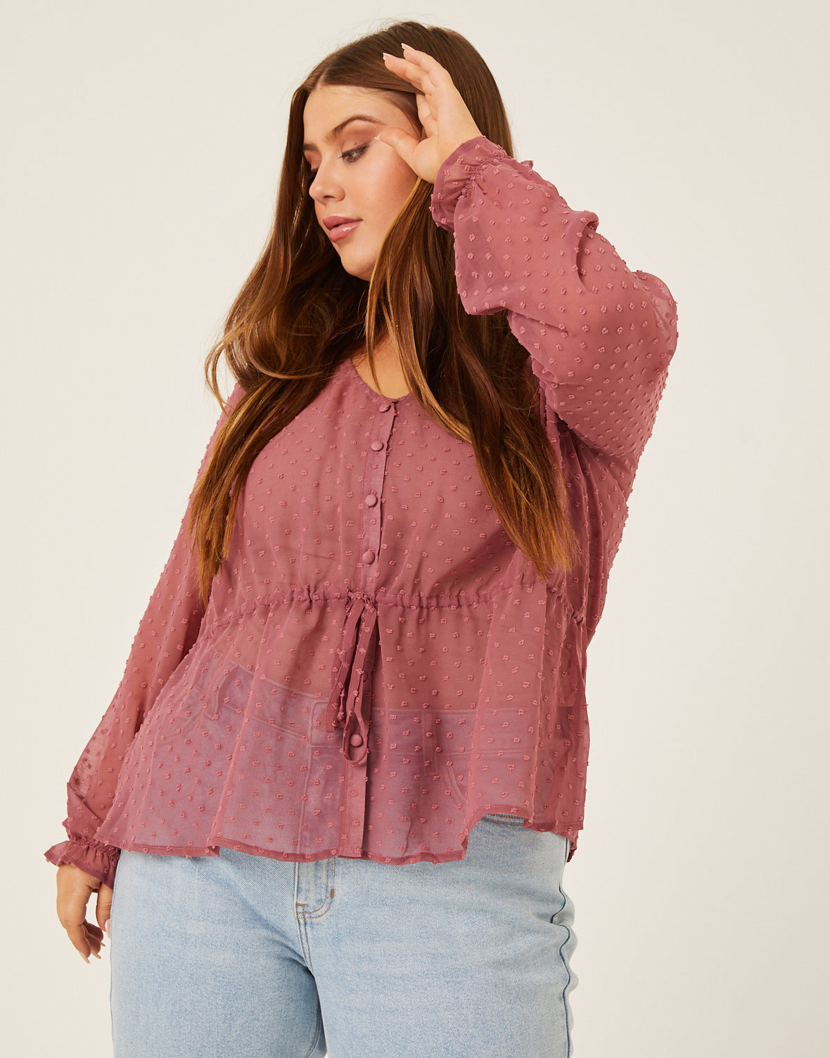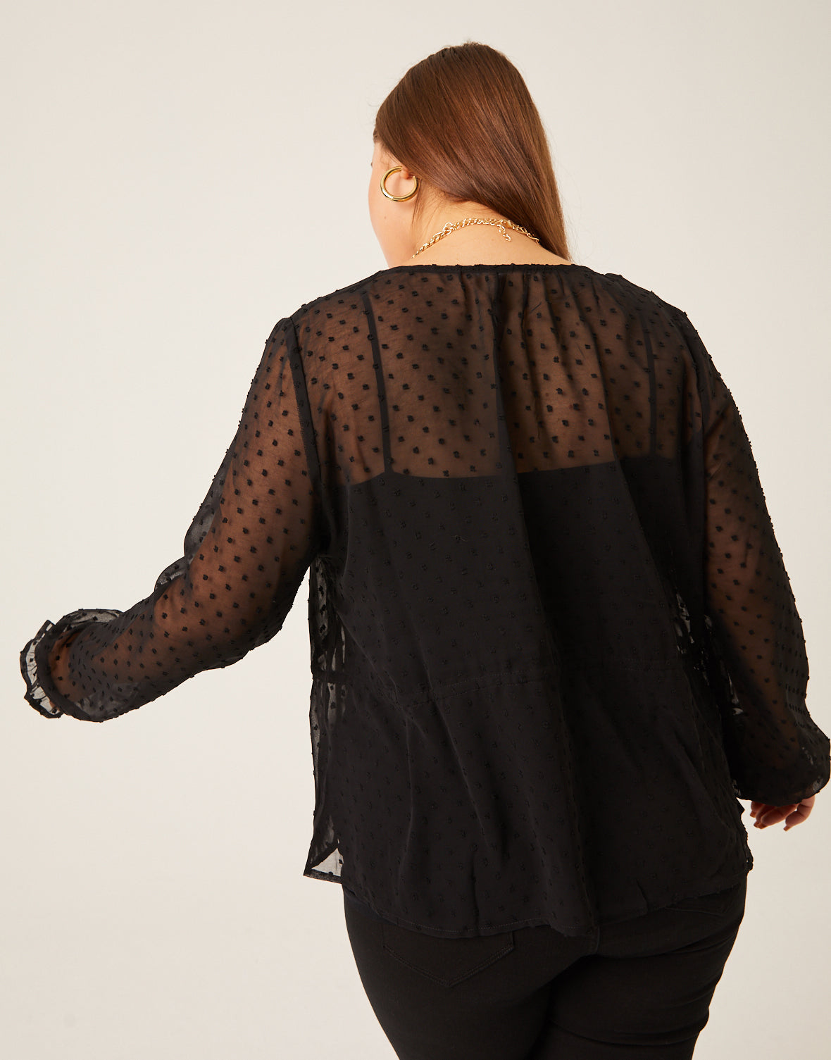 A romantic, feminine top, the?Curve Sheer Swiss Dot Blouse is great for date night or any night out. This plus size sheer top looks?great paired with a?dark pair of or a? simple and some cute boots for a date night look.