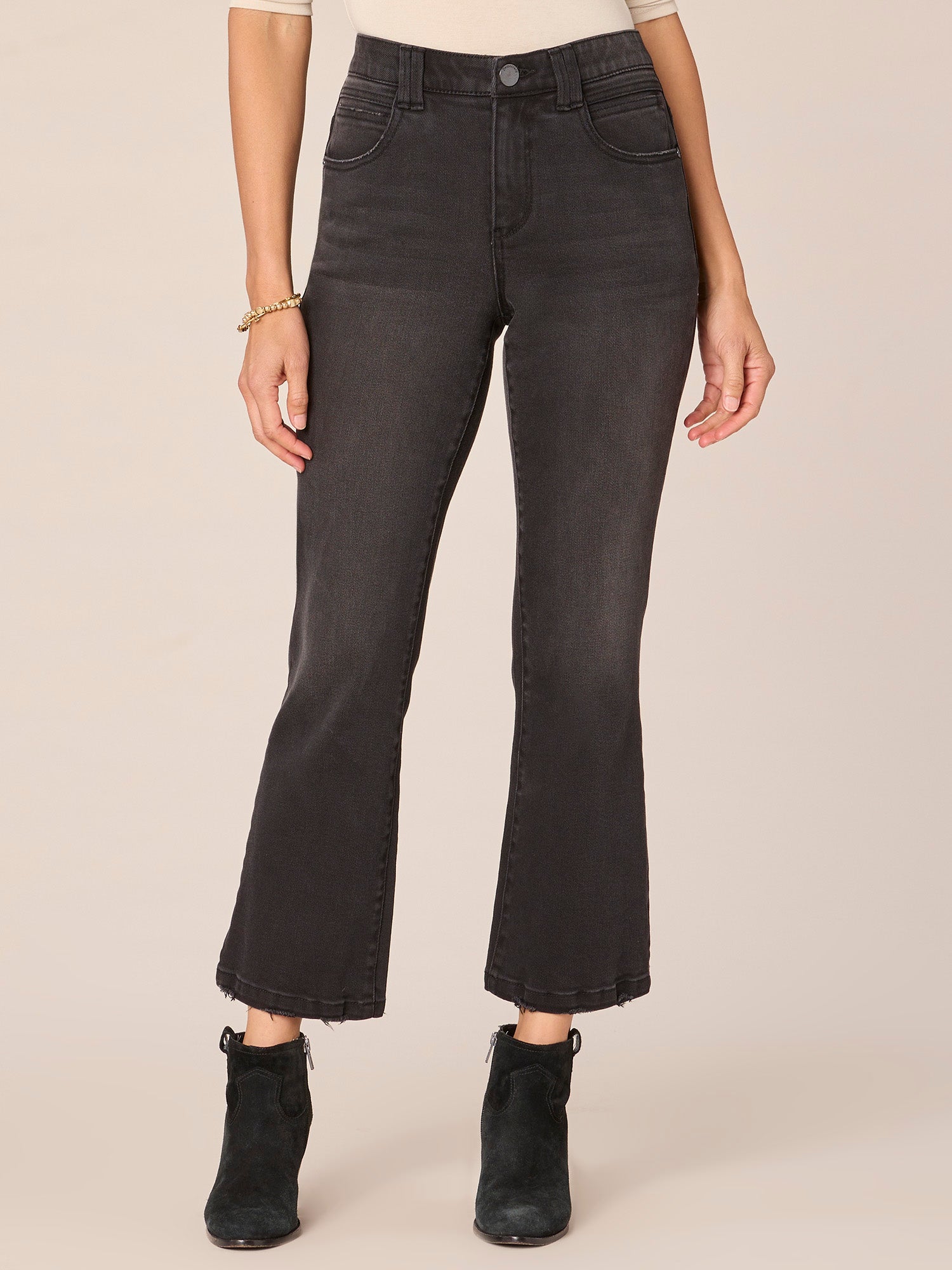 Black jeans always have a place in our wardrobes, but this Itty Bitty Flare silhouette in a washed black artisanal wash may give your old pair a run for their money. This slightly worn trend flatters your shape and adds stylish details to your look with a high rise waist, cropped grinded hems with strings, and a sweetheart shaped back yoke, as well as our signature mold-and-hold “Ab”solution® fit technology.