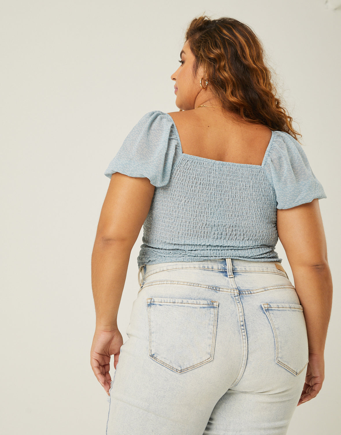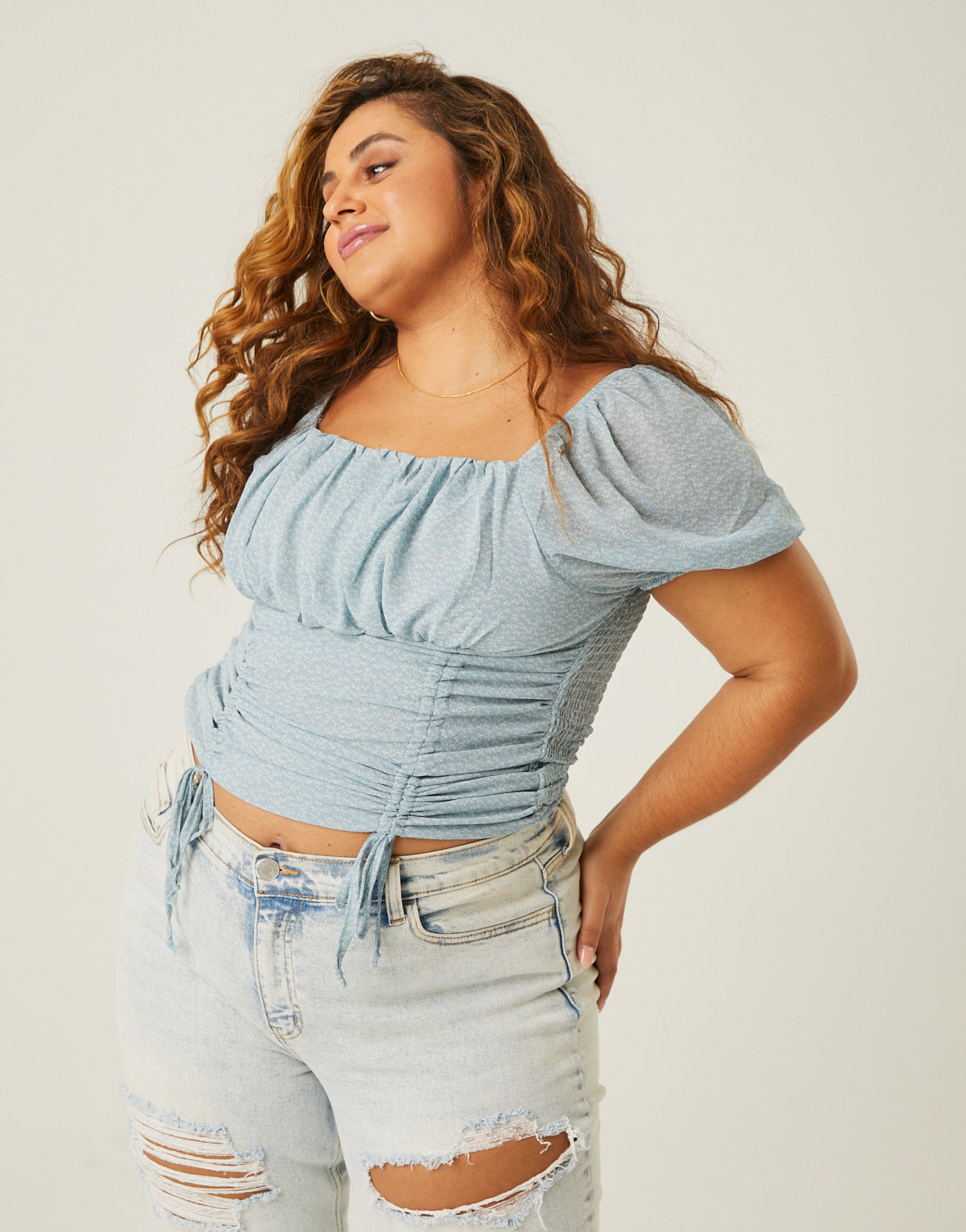 - This top features double ruching up front that is adjustable and ties at the bottom, a gathered bustline, a smocked back, and short puff sleeves.