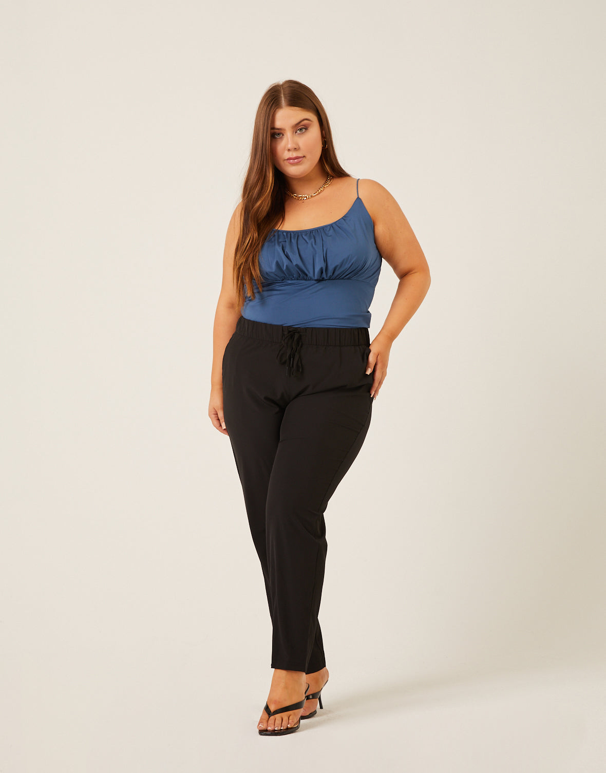 - This cute plus sized tank top features non-adjustable, elastic spaghetti straps, a gathered bust, and a cropped fit.
