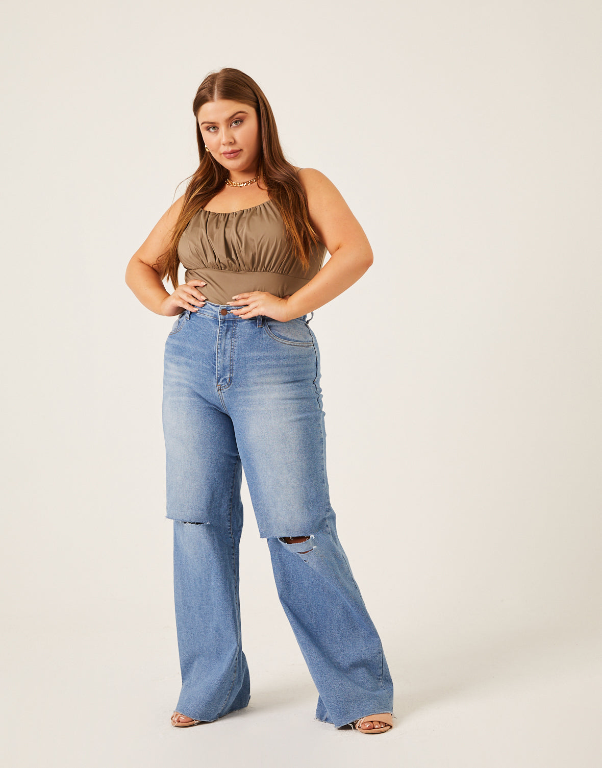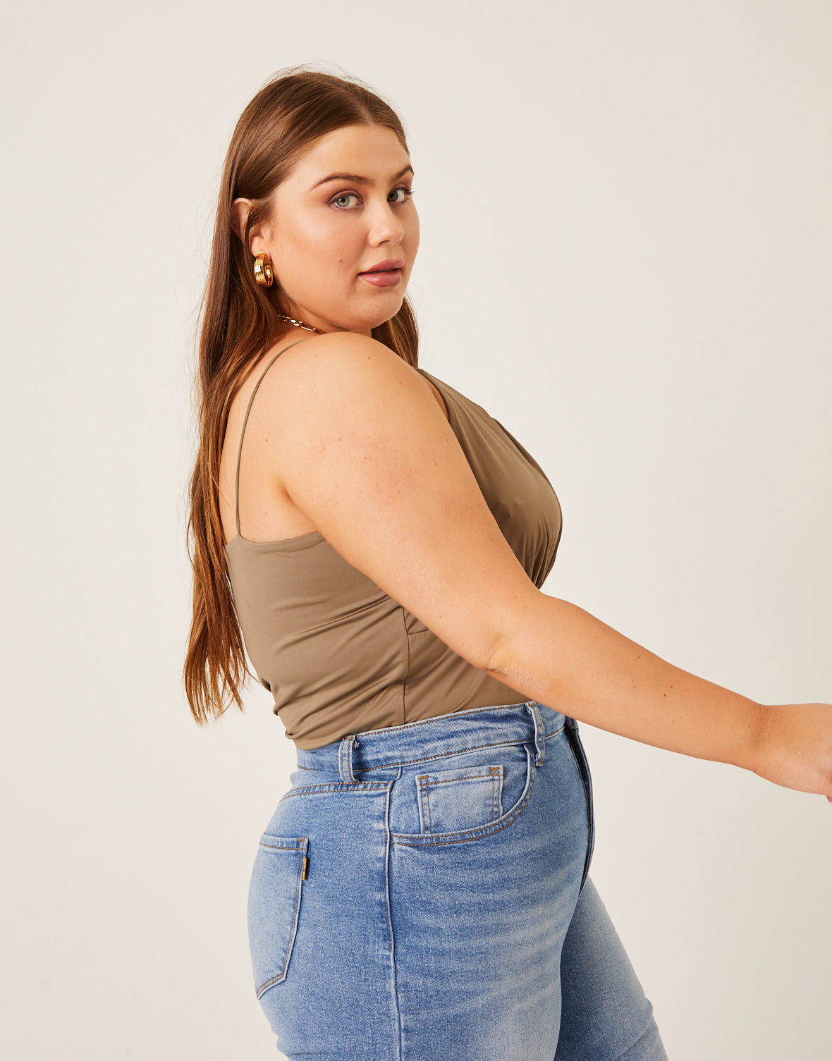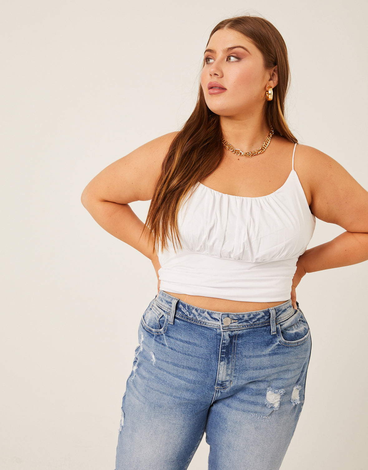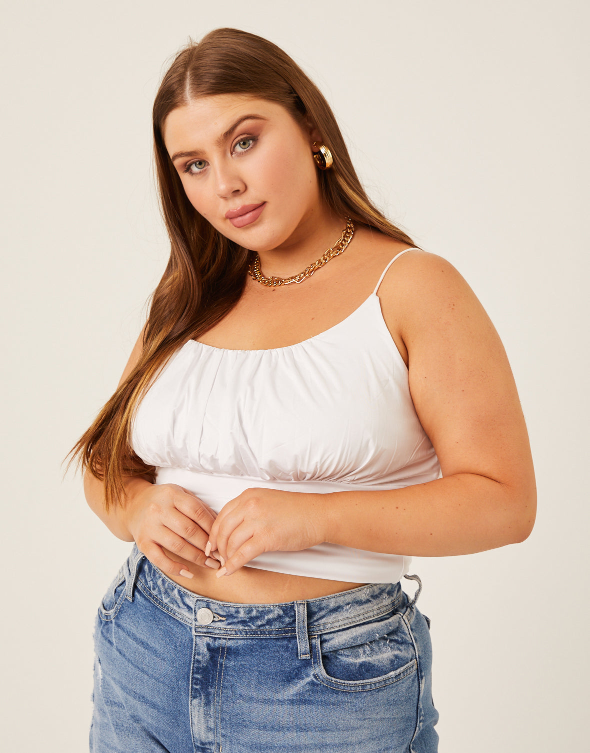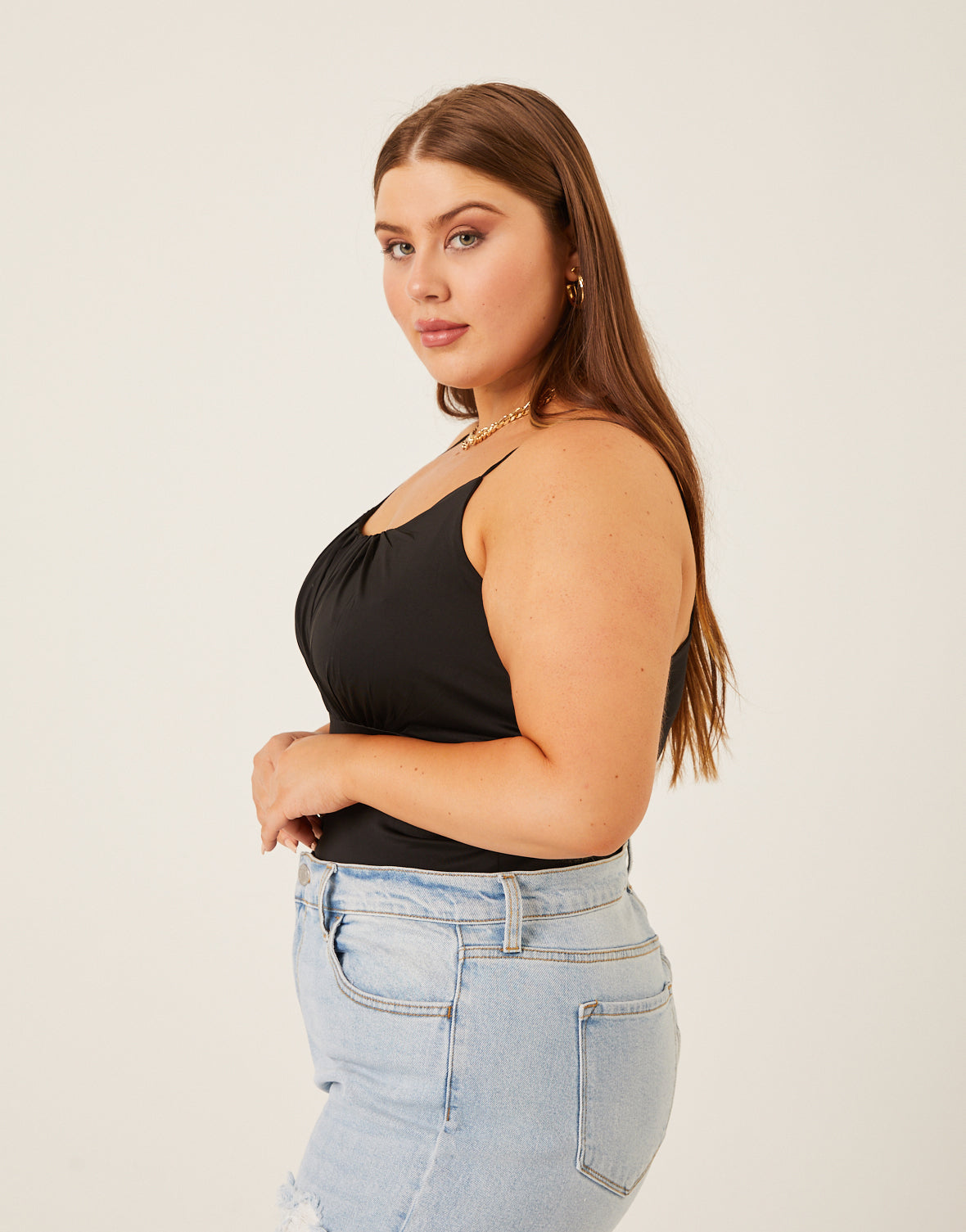 The Curve Gathered Bust Tank is cute on its own or worn as a layer. A great plus size tank top, this cropped top is simple while still being charming and unique. The gathered bust is flattering and the rounded neckline is perfect for showing off a few cute layered . Whether you wear it on its own with a pair of jeans or wear it under a cute or coat for a layered look, this tank is sure to be one of your favorite not-so-basic basics.